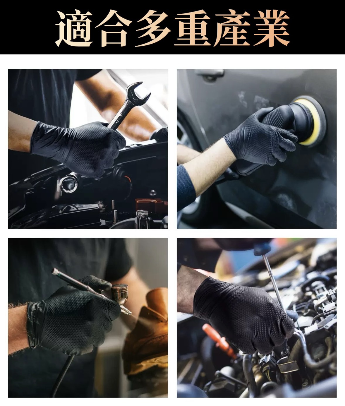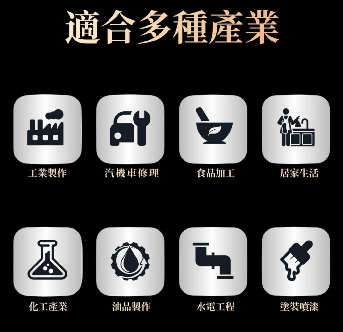 適用於工業生產、汽車修理、衛生清潔、食品加工、化學加工、管道施工、油漆繪畫等行業。